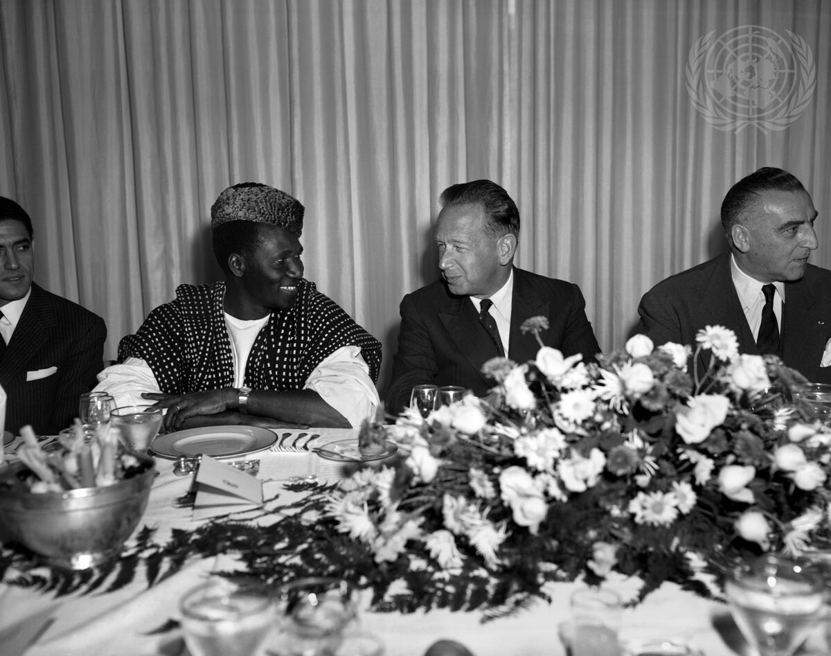 Mr. Sékou Touré, President of the Republic of Guinea, paid an official visit to United Nations Headquarters today. President Touré (left) is seen here at the luncheon given is his honour by UN Secretary-General Dag Hammarskjöld who is also seen here in the Security Council lounge where the luncheon took place.