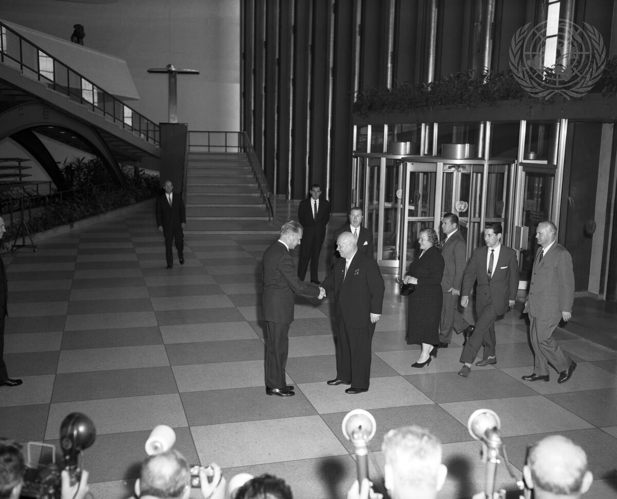 Here, on his arrival at United Nations Headquarters, Premier Khrushchev is greeted by UN Secretary-General Dag Hammarskjöld (left). The Premier is followed by Mrs. Khrushchev and, at extreme right, Mr. Mikhail Menshikov, Ambassador of the USSR to the United Nations.