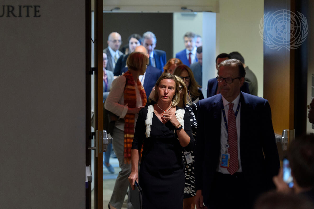 Federica Mogherini (centre), High Representative of the European Union for Foreign Affairs and Security Policy and Vice-President of the European Commission, on her way to a press briefing following the meeting between members of the Joint Comprehensive Plan of Action (JCPOA) and Iran.