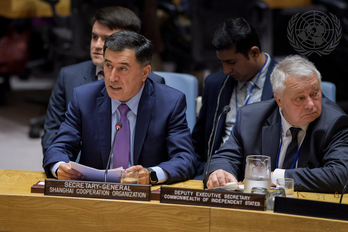 Vladimir Imamovich Norov, Secretary-General of the Shanghai Cooperation Organisation, addresses the Security Council meeting on cooperation between the United Nations and regional and subregional organizations in maintaining international peace and security. The focus of the meeting is the contribution of the Collective Security Treaty Organization, the Commonwealth of Independent States and the Shanghai Cooperation Organization in countering terrorist threats. At right is Sergey Ivanov, Deputy Executive Secretary of the Commonwealth of Independent States.