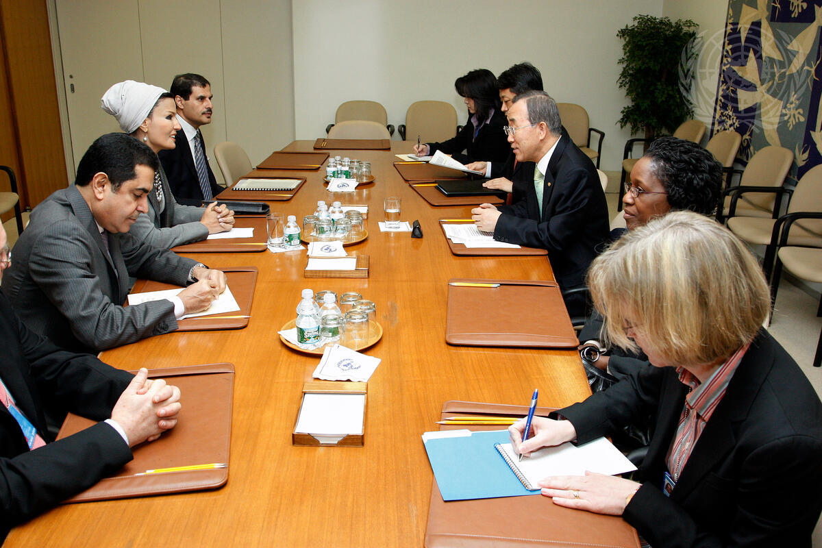 Secretary-General Ban Ki-moon (third from right, right side of table) holds a meeting with Mozah bint Nasser Al-Missned (second from left, left side of table), Consort of the Emir of the State of Qatar and the Special Envoy for Basic and Higher Education of the United Nations Education, Scientific and Cultural Organization (UNESCO).