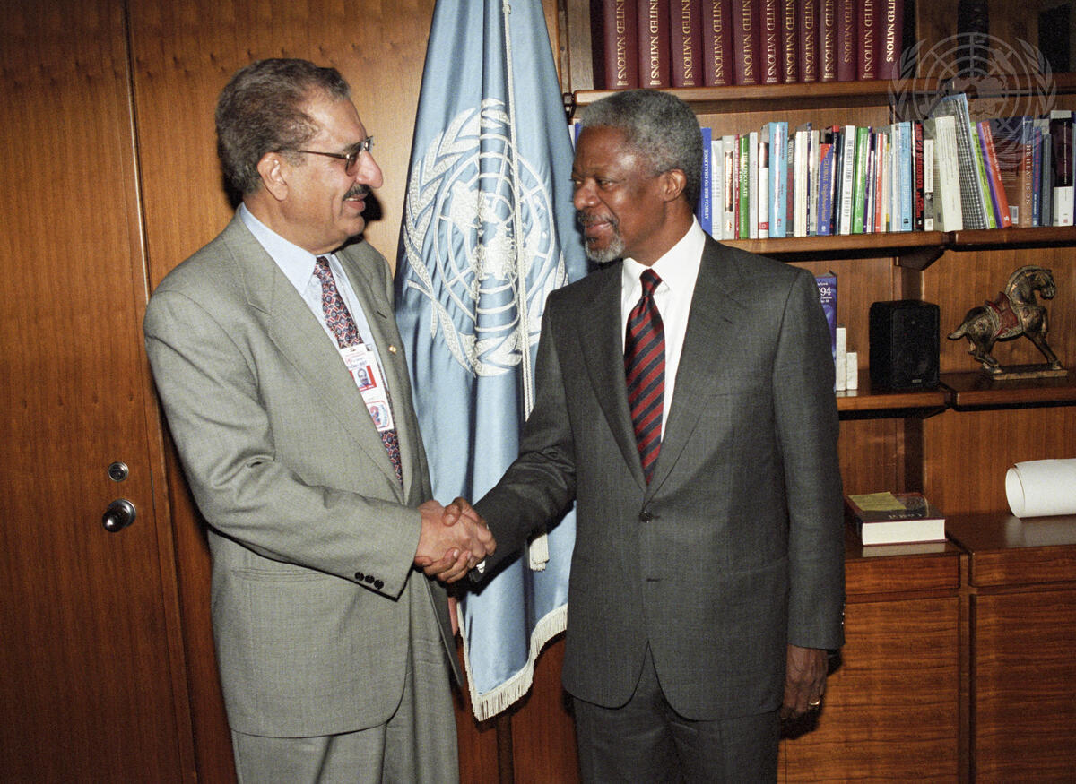 Secretary-General Kofi Annan (right) meets with Darshan Johal, Acting Executive Director of the United Nations Centre for Human Settlements (HABITAT).