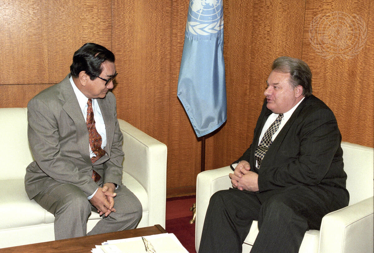 Hennadiy Udovenko (right), Ukraine, President of the fifty-second session of the General Assembly, meets with Ohn Gyaw, Minister for Foreign Affairs of Union of Myanmar.