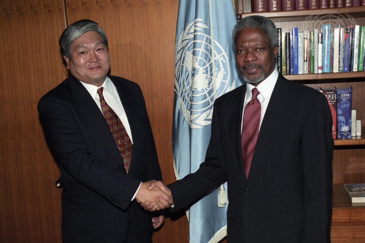 Secretary-General Kofi Annan (right) meets with Shukheriin Altangerel, Foreign Minister of Mongolia.