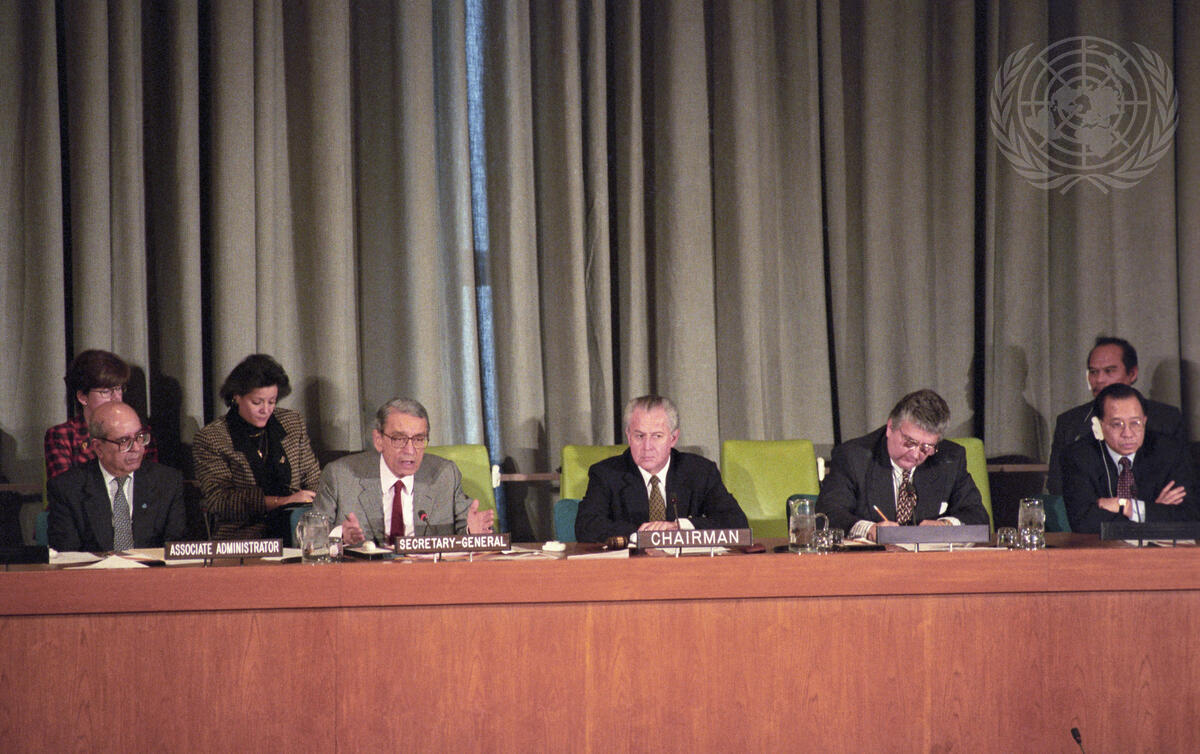 From left to right at the head-table are: Rafeeuddin Ahmed, Associate Administrator, United Nations Development Programme (UNDP); Secretary General Boutros Boutros-Ghali; Ambassador Fernando Berrocal Soto (Costa Rica), incoming Chairman; Fernando Naranjo Villalobos, Foreign Minister of Costa Rica; Ambassador Felipe Mabilangan (Philippines), outgoing Chairman.