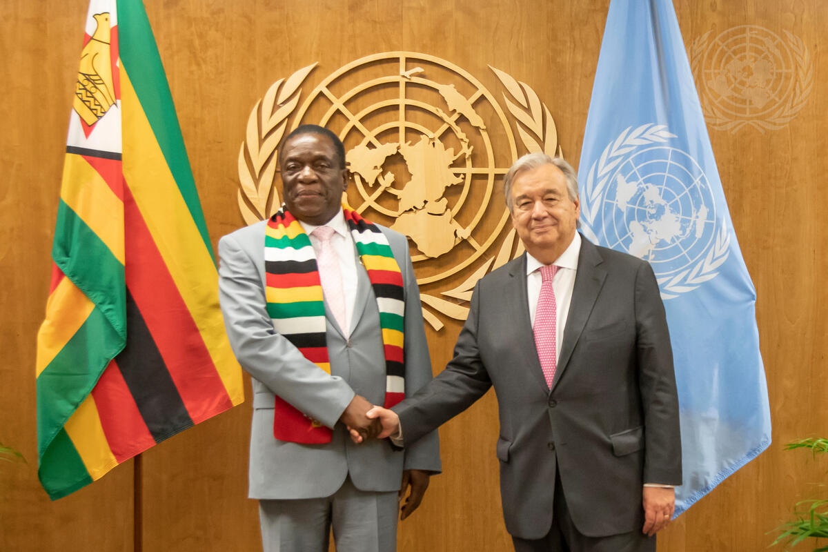 Secretary-General António Guterres (right) meets with Emmerson Dambudzo Mnangagwa, President of the Republic of Zimbabwe.
