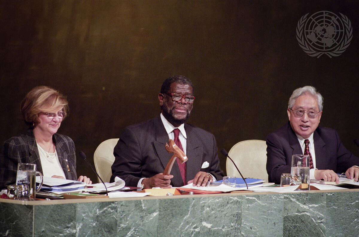 Theo-Ben Gurirab (Namibia), President of the fifty-fourth session of the General Assembly, presides over the final meeting of that session. He is flanked by Deputy Secretary-General Louise Frechette (left) and by Jin Yonjian, Under-Secretary-General for General Assembly Affairs and Conference Services.