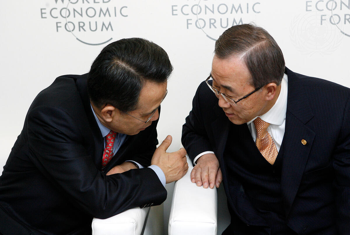 Secretary-General Ban Ki-moon (right) has a tête-à-tête with Han Seung-soo, Prime Minister of the Republic of Korea.