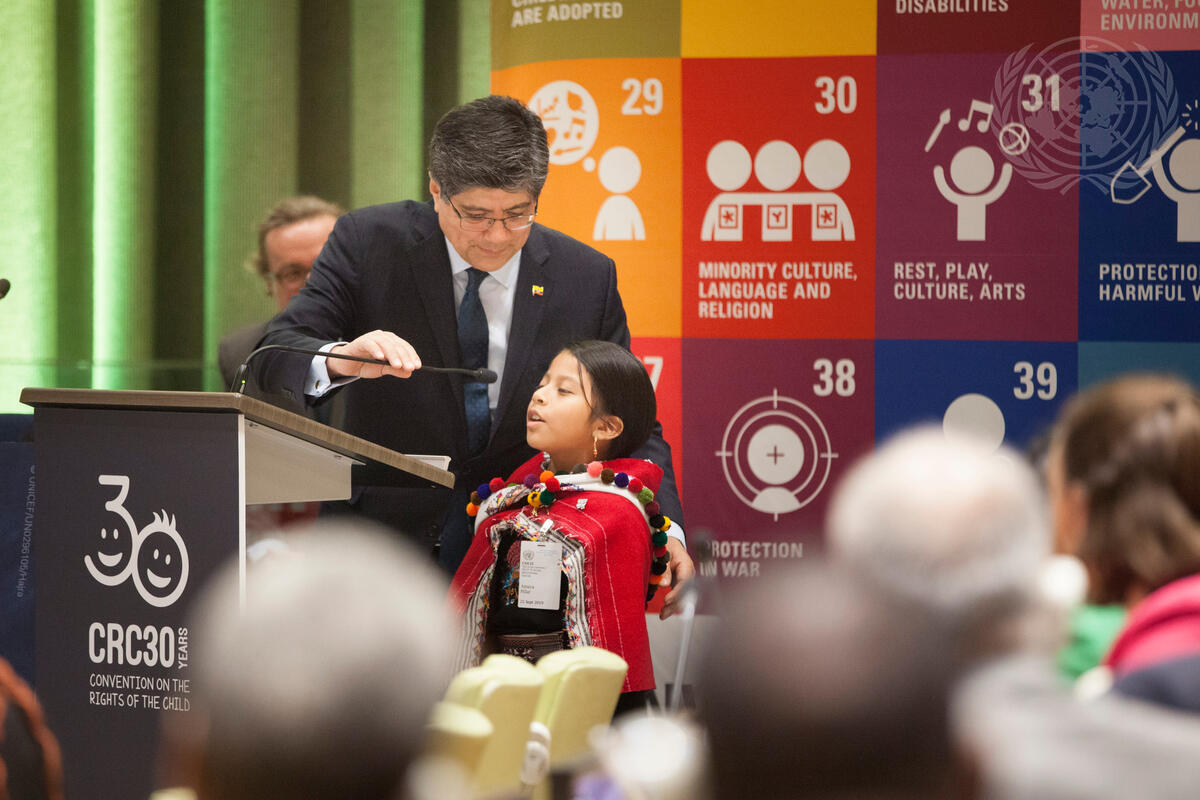 Amaya Pilla Masaquiza speaks at the high-level commemorative event of the General Assembly on thirtieth anniversary of the adoption of the Convention on the Rights of the Child.