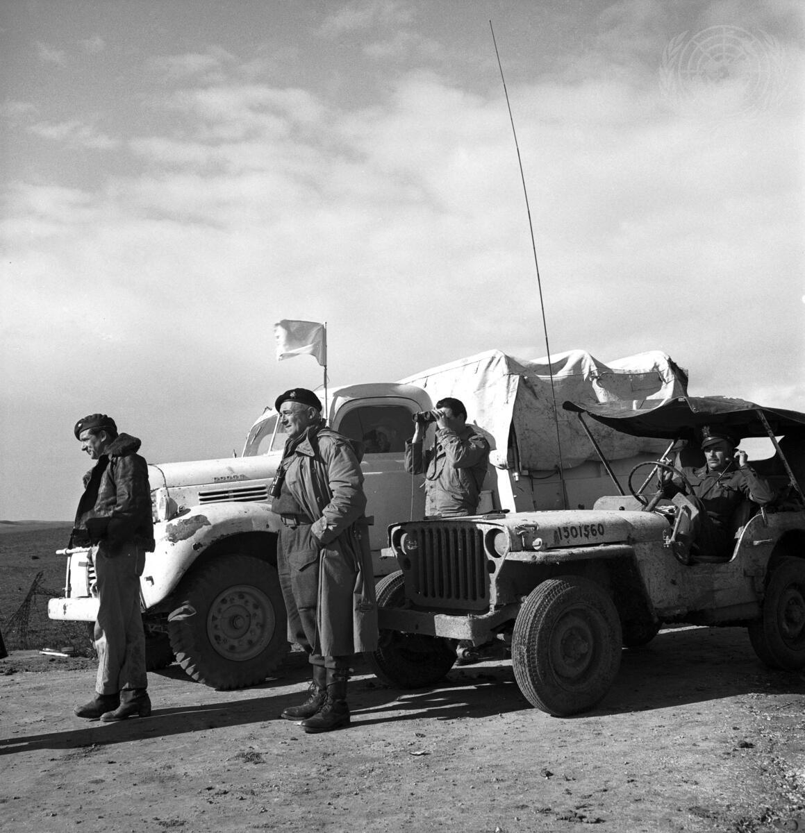 Peaceful evacuation of Al Faluja is ensured by United Nations escorts. The Israeli authorities extended their full cooperation to help avoid incidents during the withdrawal movements. The route was cleared of obstructions and Israeli troops received orders to keep away from the road used by the convoy. [on or around 26 February 1949]