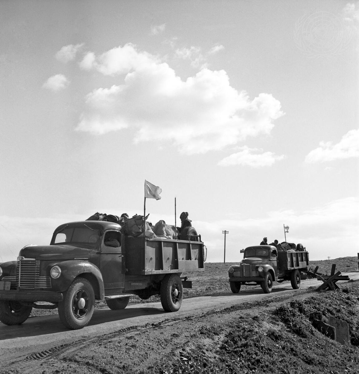 Peaceful evacuation of Al Faluja is ensured by United Nations escorts. The Israeli authorities extended their full cooperation to help avoid incidents during the withdrawal movements. The route was cleared of obstructions and Israeli troops received orders to keep away from the road used by the convoy. [on or around 26 February 1949]