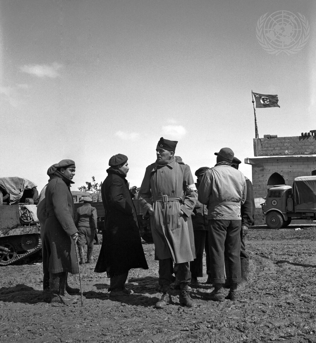 Peaceful evacuation of Al Faluja is ensured by United Nations escorts. The Israeli authorities extended their full cooperation to help avoid incidents during the withdrawal movements. The route was cleared of obstructions and Israeli troops received orders to keep away from the road used by the convoy. [on or around 26 February 1949]