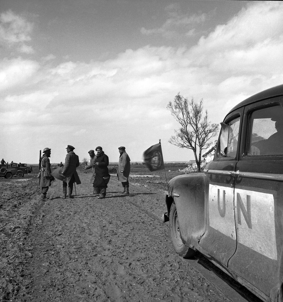 Peaceful evacuation of Al Faluja is ensured by United Nations escorts. The Israeli authorities extended their full cooperation to help avoid incidents during the withdrawal movements. The route was cleared of obstructions and Israeli troops received orders to keep away from the road used by the convoy. [on or around 26 February 1949]