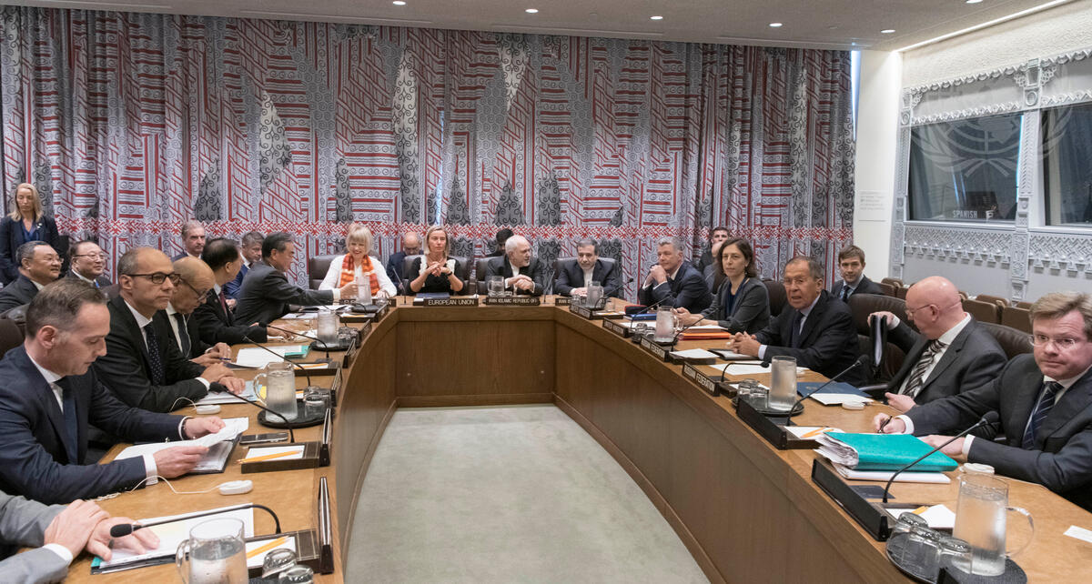 At the head of the table are (centre right) Javad Zarif, Minister for Foreign Affairs of the Islamic Republic of Iran, and (centre left) Federica Mogherini, High Representative of the European Union for Foreign Affairs and Security Policy and Vice-President of the European Commission. At third from right is Sergey V. Lavrov, Minister for Foreign Affairs of the Russian Federation. At his right is Vassily Nebenzia, Permanent Representative of the Russian Federation to the United Nations. At left is Heiko Maas, Federal Minister for Foreign Affairs of Germany. At third from left is Jean-Yves Le Drian, Minister for Foreign Affairs of the Republic of France. At fifth from left is Wang Yi (centre), Minister for Foreign Affairs of the People’s Republic of China.