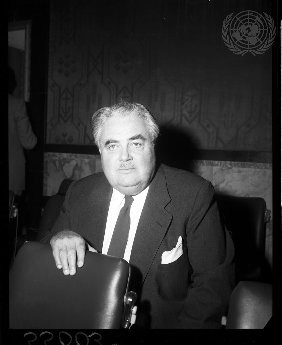 A view of Herman Wells, a member of the delegation of the United Status of America to the 12th session of the UN General Assembly, photographed in a conference room at UN Headquarters.