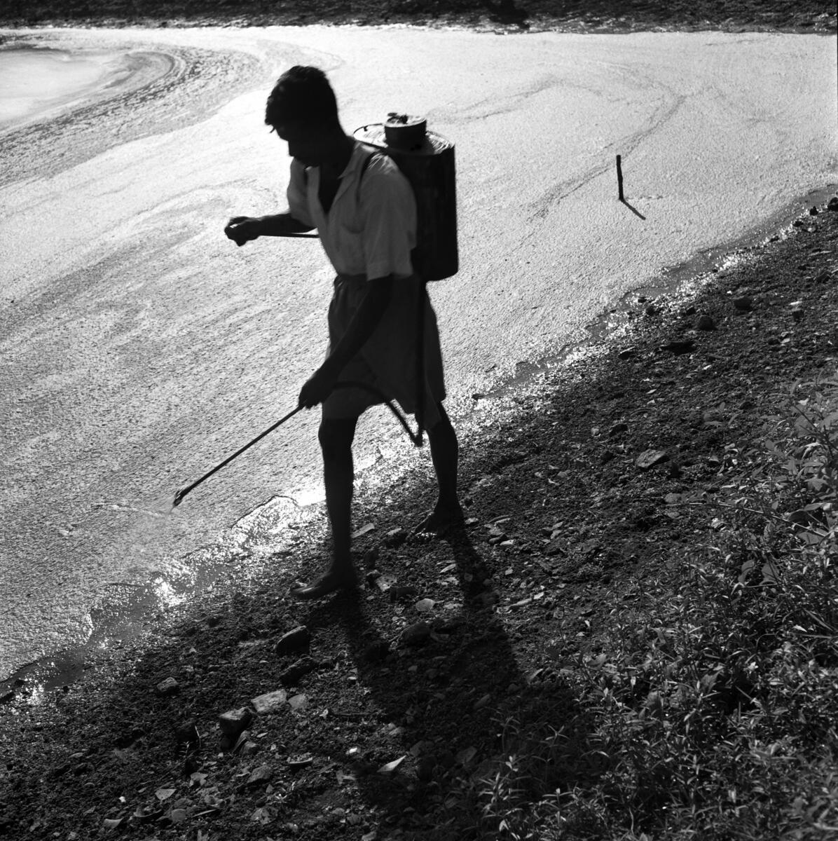 A mosquito control team spraying sewage tank borders with oil in the village of Barpur in the Terai region.