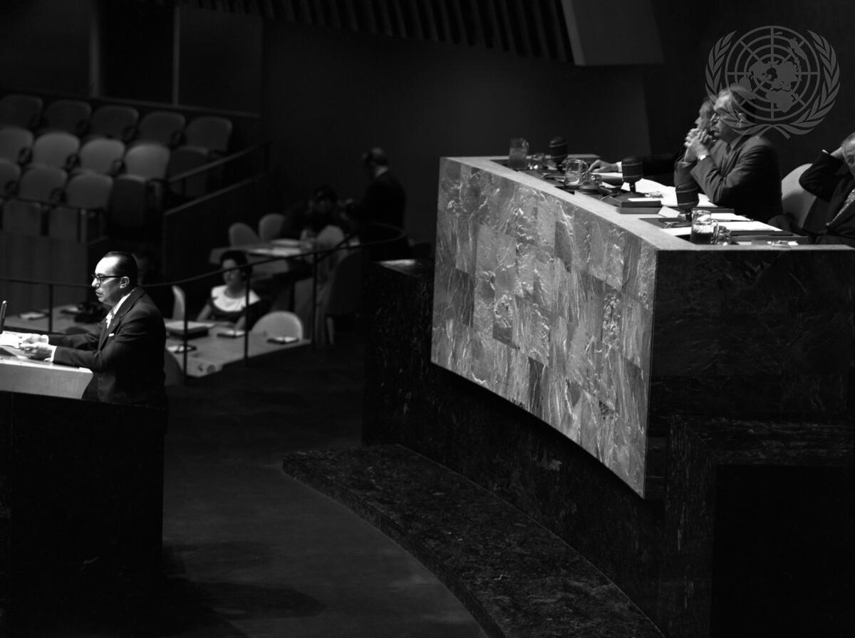 Dr. Raul Sapena Pastor (left), Minister for External Relations of Paraguay and Chairman of his country’s Delegation, addressing the General Assembly this morning. On the rostrum behind him are (left to right): U.N. Secretary-General Dag Hammarskjöld; Assembly President, Sir Leslie Munro (New Zealand); and Andrew W. Cordier, Executive Assistant to the U.N. Secretary-General.