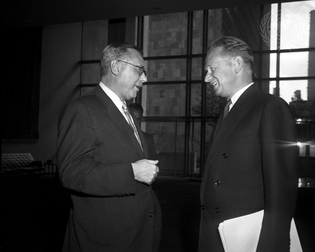 The Secretary-General is seen here, shortly after his re-election exchanging views with Mr. A. A. Sobolev (left), Permanent Representative of the USSR to the United Nations and member of his country's delegation to the current (12th) session of the General Assembly.