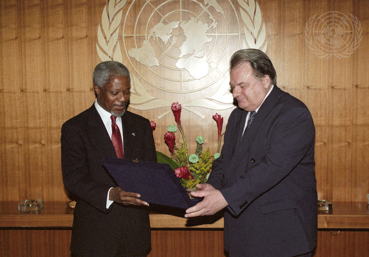 Secretary-General Kofi Annan (left) meets with Hennadiy Udovenko (Ukraine), President of the 52nd session of the General Assembly, during a ""Coupe de champagne"" held in his honour.