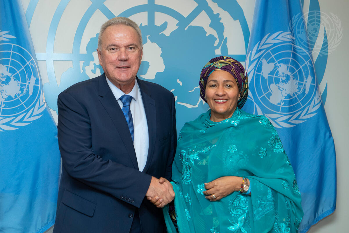 Deputy Secretary General Amina J. Mohammed (right) meets with Neven Mimica, European Union Commissioner for International Cooperation and Development, on the occasion of the Signature Ceremony of the European Union Contribution to the Joint Fund.