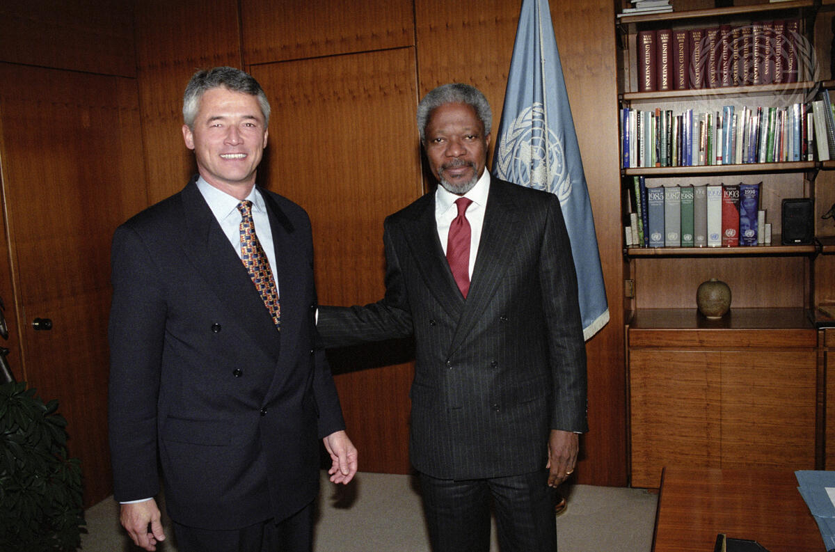 Secretary-General Kofi Annan (right) meeting with Sergio Vieira de Mello, Assistant High Commissioner, United Nations High Commissioner for Refugees (UNHCR).