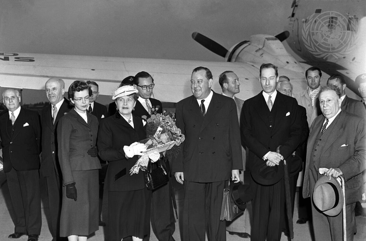 U.N. Secretary-General Trygve Lie (center), his wife and his daughter, arrived at Melsbroek airport, outside Brussels, on 25 June 1952. They were met by the Belgian Chief of Protocol Count Laubespin (right), representing Mr. P. van Zeeland, Minister for Foreign Affairs of Belgium.