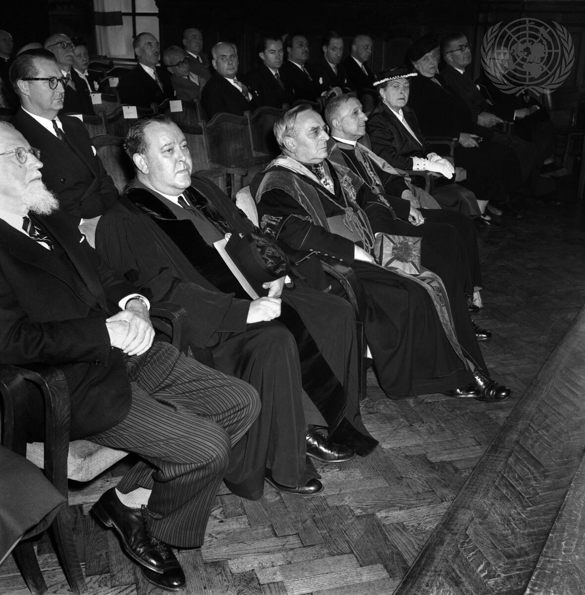 During the ceremony at the University of Louvain when the degree of Doctor h. c. in Political Sciences was conferred upon Mr. Trygve Lie, the Canon of the University, M. Leclerq, delivered a speech. Listening, from left to right: The President of the Belgian House of Representatives, M. Van Cauwenlaert; Mr. Trygve Lie, U.N. Secretary-General; the Recteur Magnifique, Monseigneur Waeyenbergh; the Papal Nuncio, Monseigneur Cento, and Mrs. Trygve Lie.