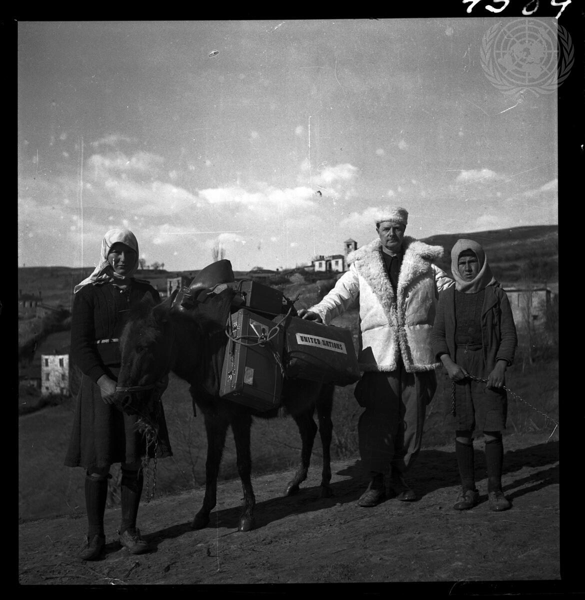 Members of the commission's investigating team left Salonika, Greece, on 12 March on an expedition by convoy and pack mule to meet the Partisan General Markos at Kastanophyto, a partisan-held village on the Greek frontier.
