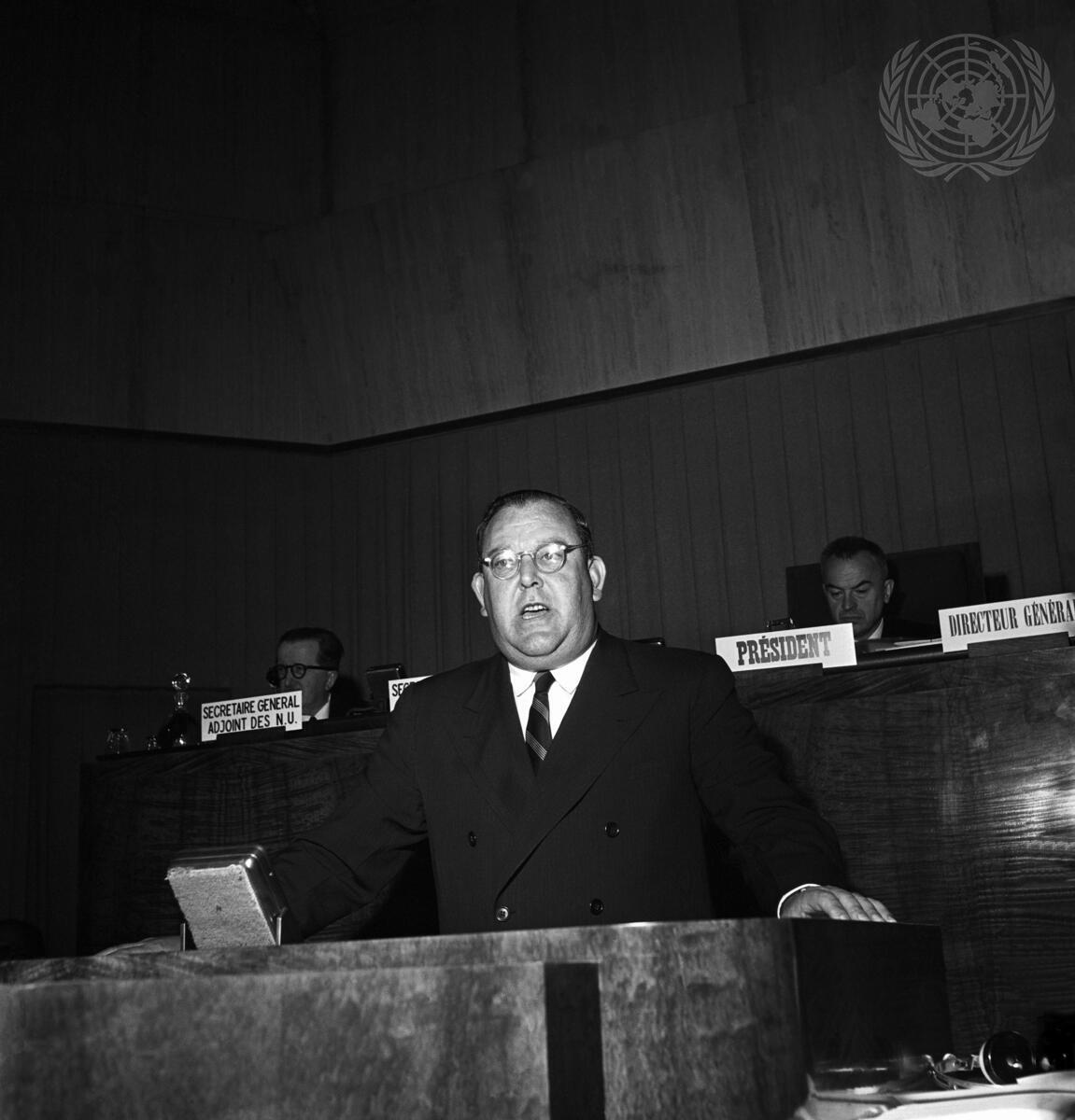 Mr. Trygve Lie, Secretary-General of the United Nations, delivers his speech at the opening meeting of the Third World Assembly of the WHO.