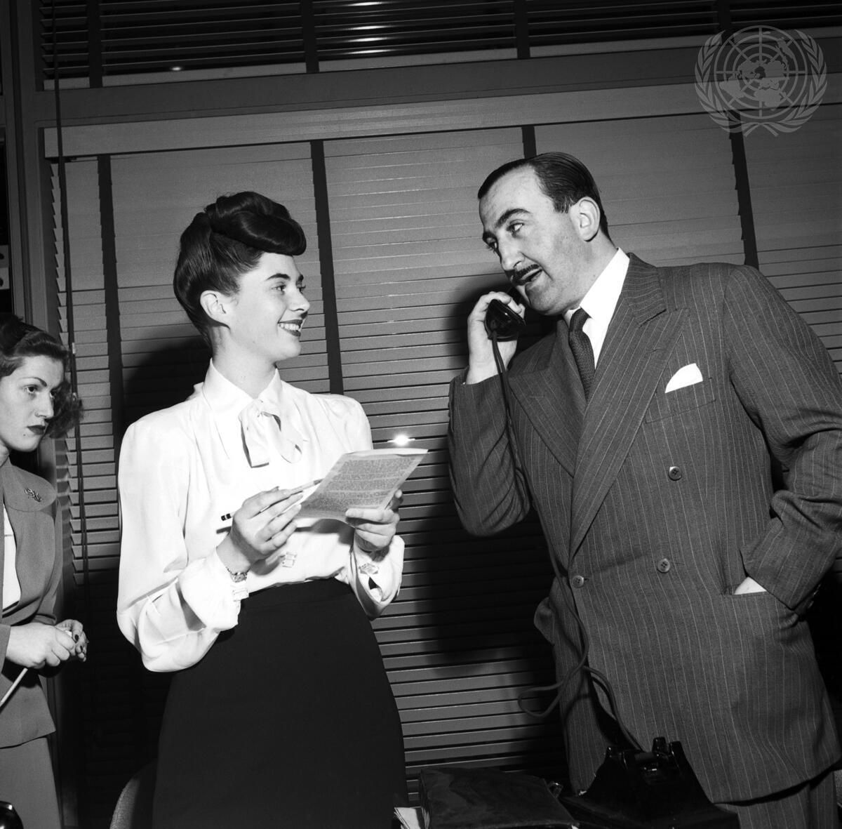 Before meeting in delegates lounge, left to right: Miss Constance Kahn, USA, U.N. Delegates aide; Hernan Santa Cruz, Chile, Delegation chairman.
