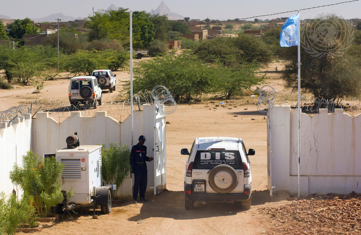 Members of the Détachement intégré de sécurité (DIS), responsible for the maintenance of law and order in the refugee camps, sites with concentrations of internally displaced persons and key towns in the neighbouring areas, leave the headquarters compound of the mission on patrol with the United Nations Police.