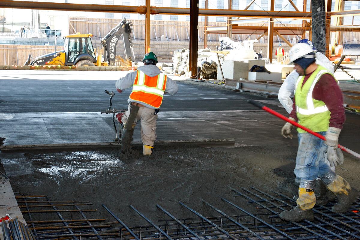 Construction workers pour concrete to complete laying the foundation of a temporary building on the North Lawn to be used as a swing space for the General Assembly, conference facilities, and for the Secretary-General and his immediate staff during the renovation of the United Nations Headquarters under the Capital Master Plan (CMP).