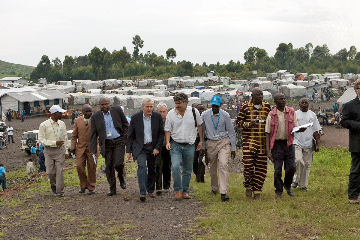 John Holmes (fourth from left), Under-Secretary-General for Humanitarian Affairs and Emergency Relief Coordinator, visits a camp of the Internally Displaced Persons (IDPs) in Kibati.