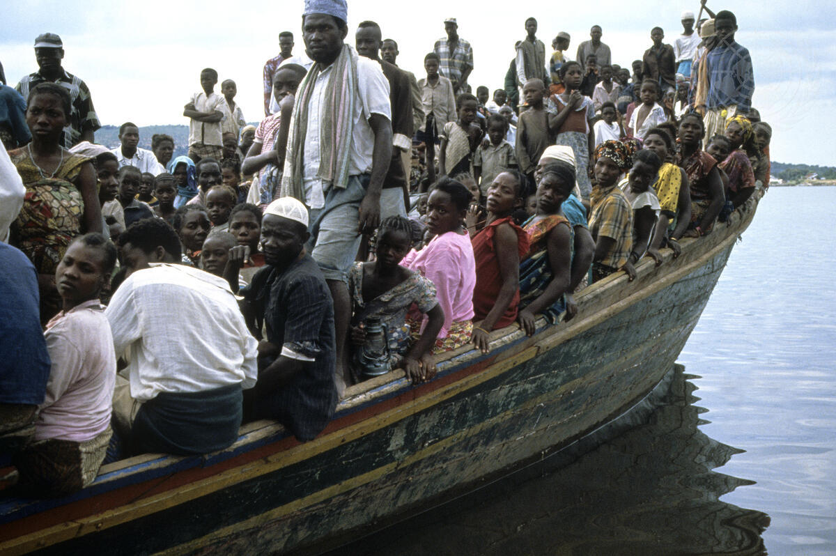 A crowded boatload of Rwandan refugees arrives at Kibiriti Port.