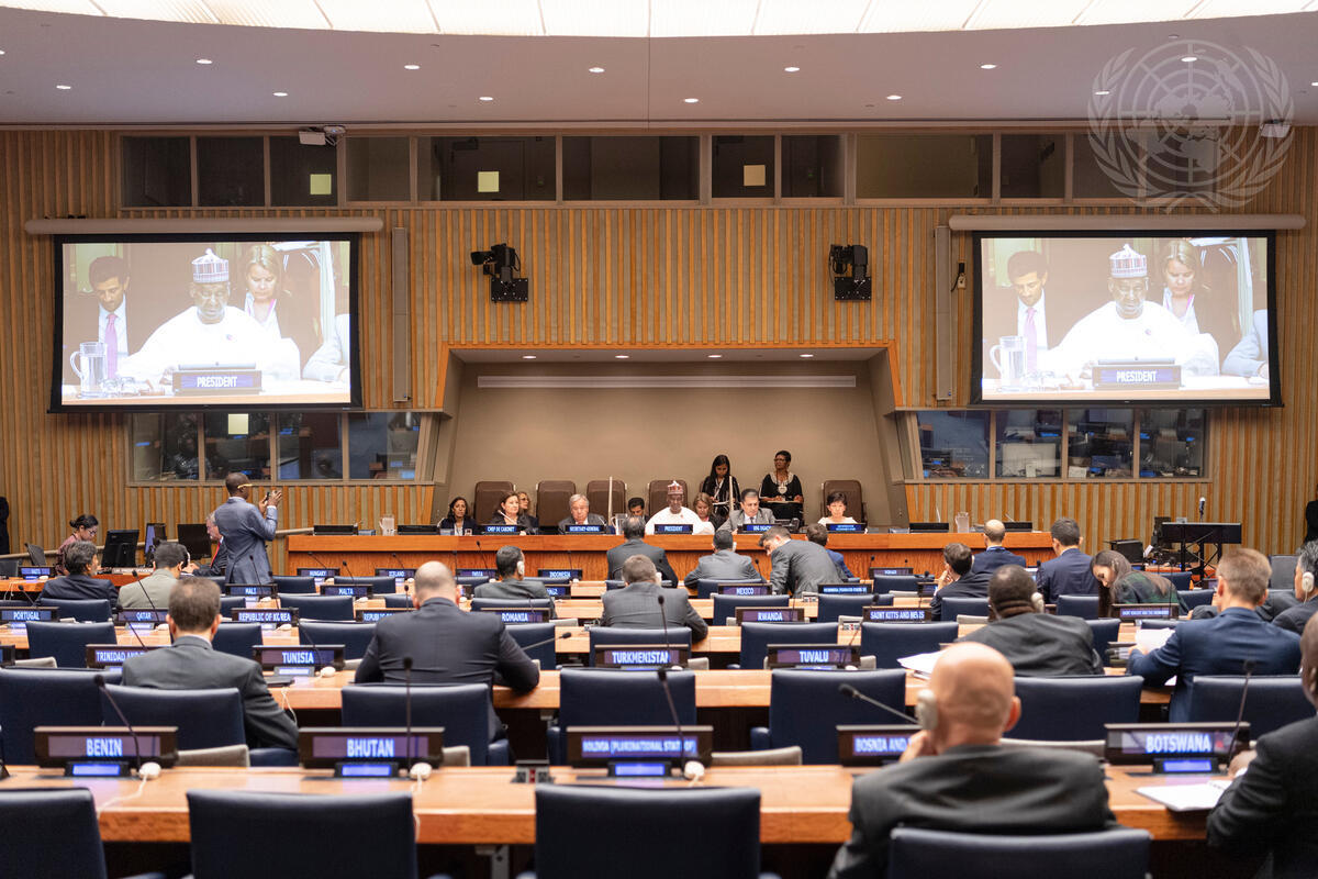 Tijjani Muhammad-Bande (on screens), President of the seventy-fourth session of the United Nations General Assembly, addresses the high-level plenary meeting to commemorate and promote the International Day for the Total Elimination of Nuclear Weapons.