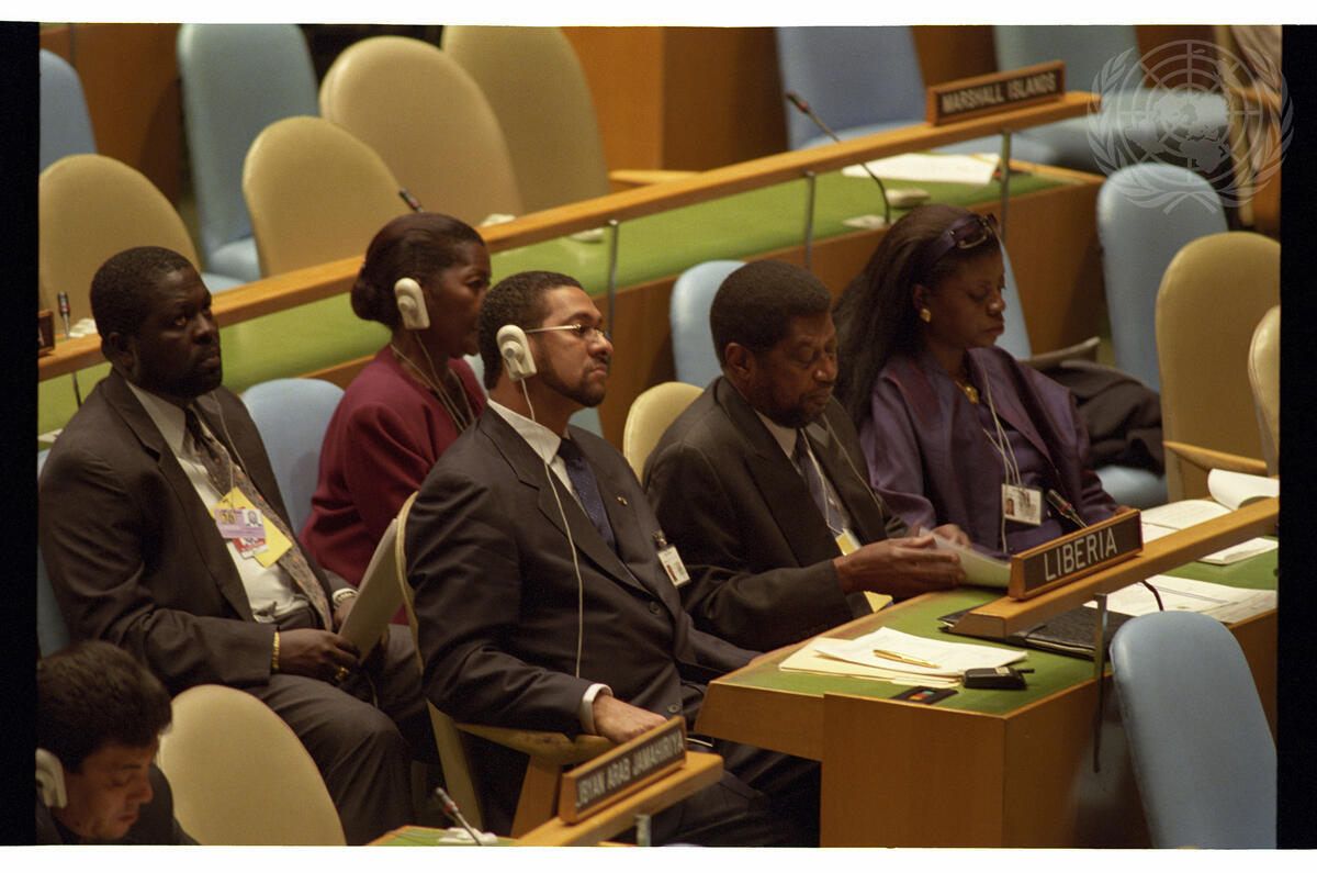 Monie R. Captan (left, behind nameplate), Minister for Foreign Affairs of the Republic of Liberia, heads his nation's delegation to the fifty-sixth session of the General Assembly.