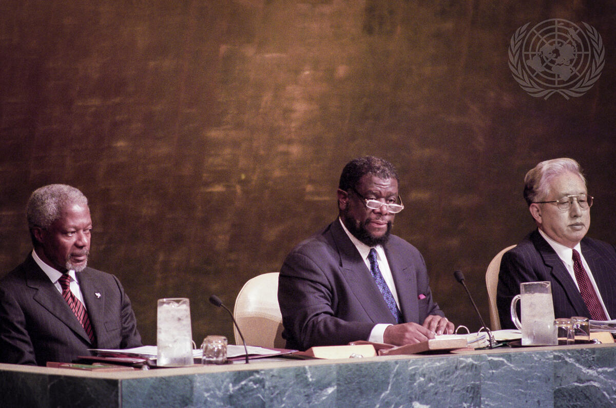 The fifty-fourth session of the General Assembly opened today. Theo-Ben Gurirab, Minister for Foreign Affairs of the Republic of Namibia, was elected President of the General Assembly. Seated to the left is Secretary-General Kofi Annan, and to the right is Jin Yongjian, Under-Secretary-General for General Assembly Affairs and Conference Services.