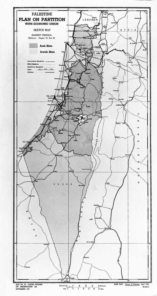 A sketch map of the plan on partition of Palestine, with economic union, proposed by the majority of the United Nations Special Committee on Palestine. The plan envisages the division of Palestine into 3 parts: an Arab State (dark tint), and the City of Jerusalem (white), to be placed under an International Trusteeship system.