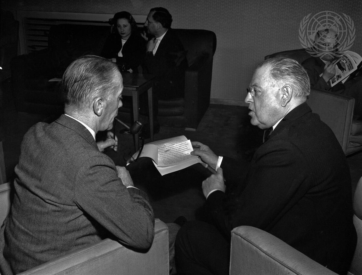 Sir Alexander Cadogan, of the United Kingdom (left) with Warren R. Austin, of the United States.