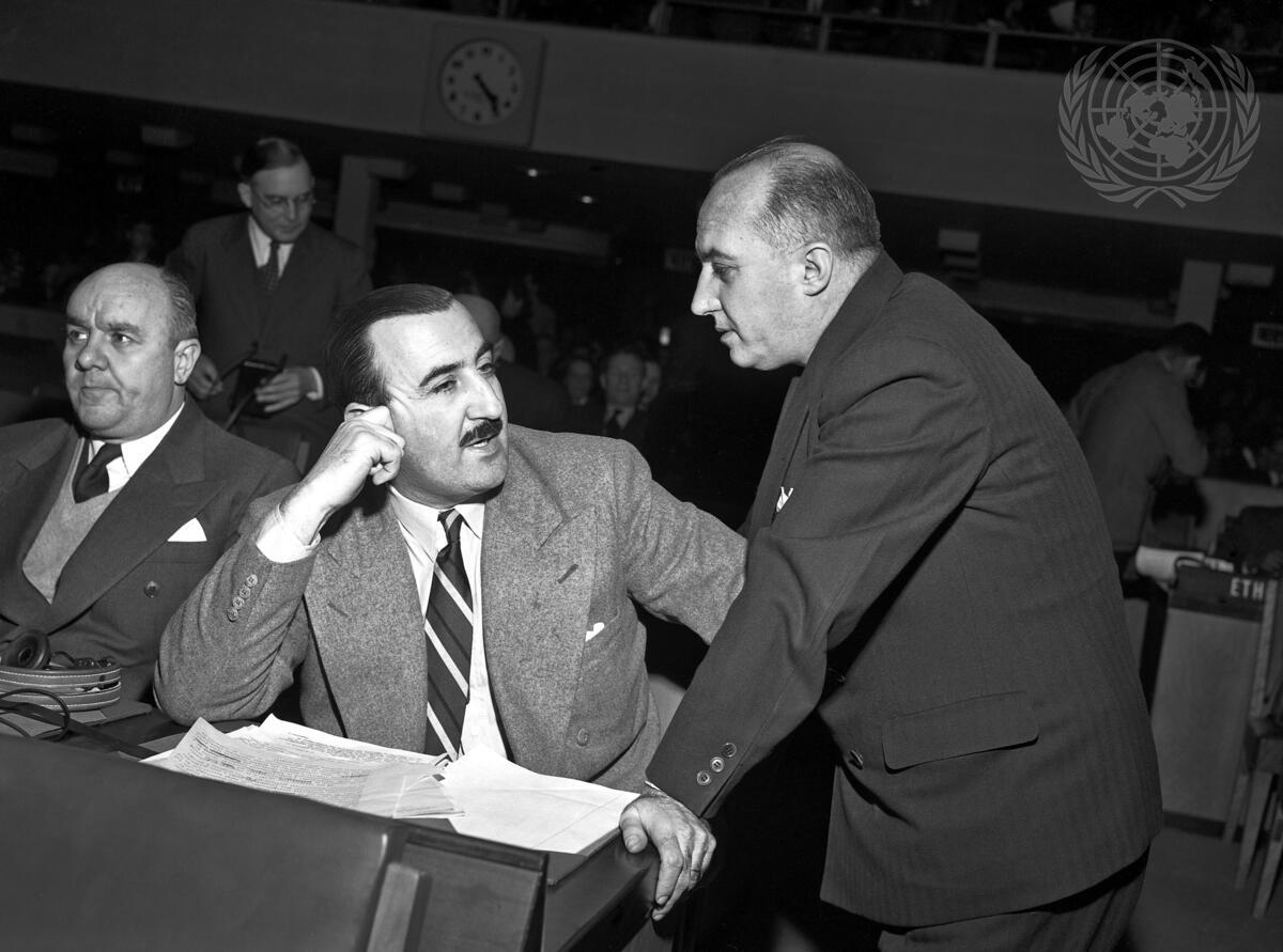 The Assembly approved the partition of Palestine into Arab and Jewish States, by a vote of 33 to 13, with 10 abstentions and one absence. Hernan Santa Cruz, left, Permanent Chilean Representative to the United Nations, talks with Jorge Garcia Granados (Guatemala), delegation Chairman, before the final meeting of the Second Session of the United Nations General Assembly.