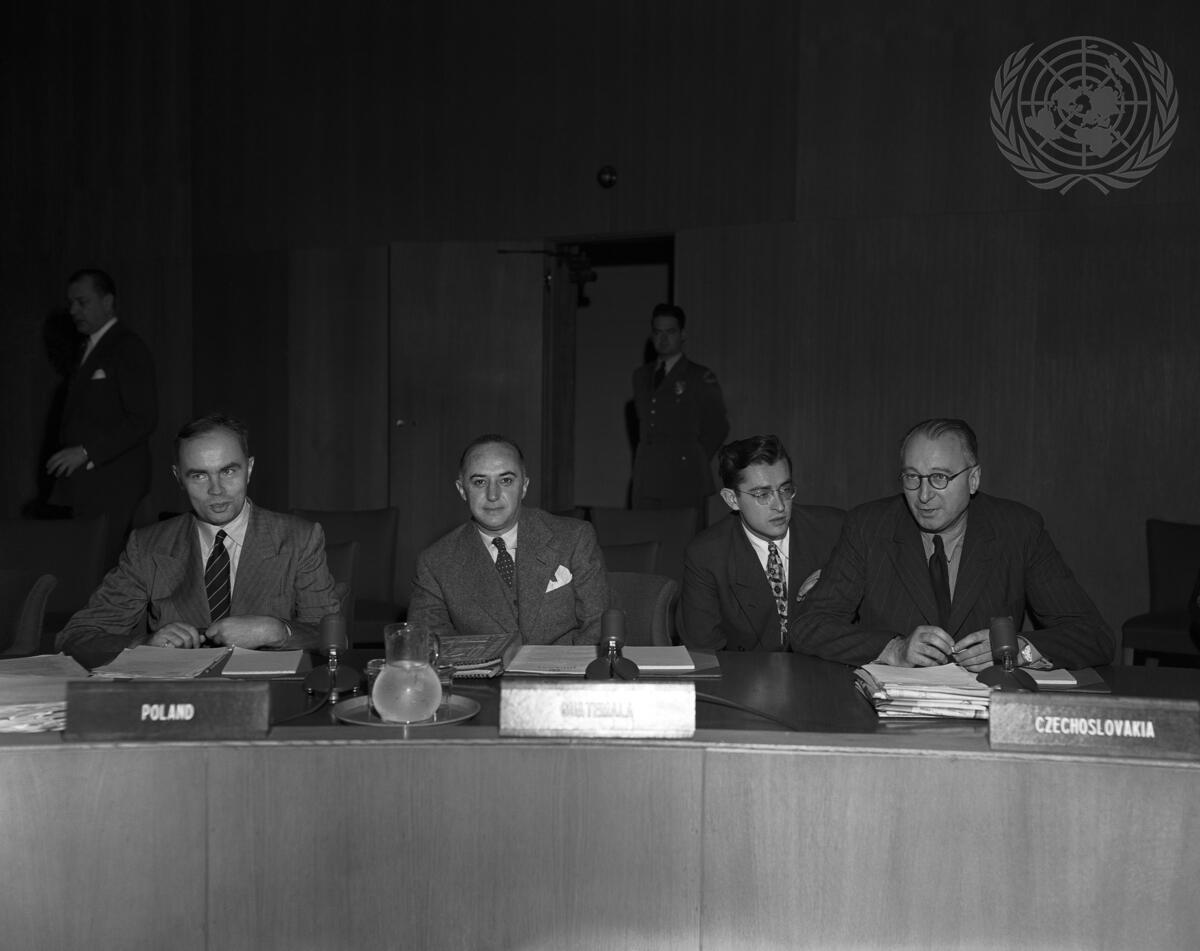 Partial view of first meeting of Subcommittee I of the United Nations Ad Hoc Committee on Palestinian Question. At table, left to right, are: Ksawery Pruszynski, Poland, elected chairman of Subcommittee during first meeting; Jorge Garcia Granados, Guatemala delegation, Chairman; Karel Lisicky, Czechoslovakia.