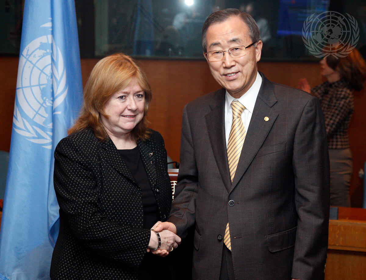 Secretary-General Ban Ki-moon (right) shakes hands with Susana Malcorra, Under-Secretary-General for Department of Field Support, after the two signed the 2009 Senior Management Compact Agreement.