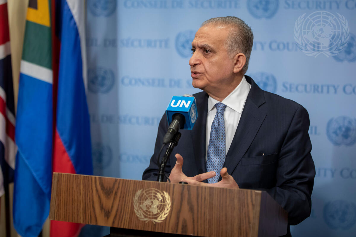 Mohamed Ali Alhakim, Minister for Foreign Affairs of the Republic of Iraq, briefs reporters together with Stef Blok, Minister of Foreign Affairs of the Kingdom of the Netherlands, at the Security Council Stakeout.