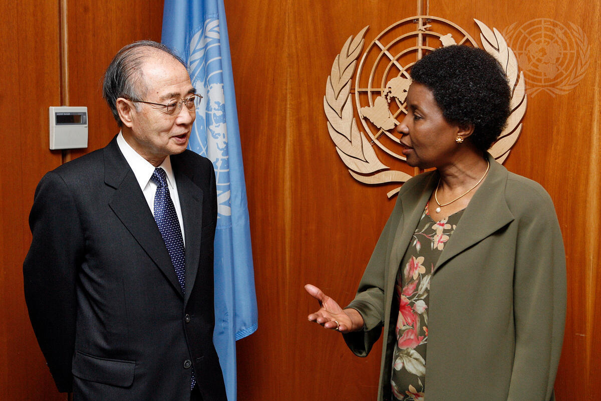 Deputy Secretary-General Asha-Rose Migiro (right) meets with Yasushi Akashi, representative of the government of Japan for peacebuilding and reconstruction in Sri Lanka.