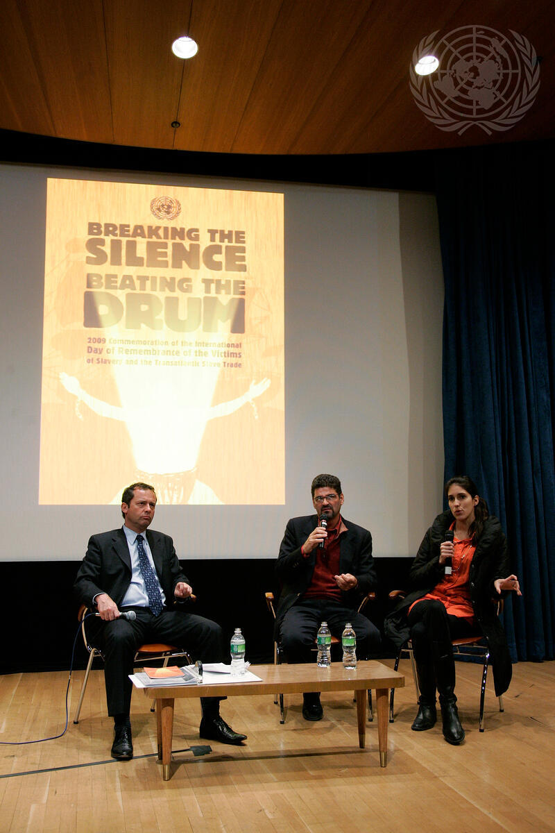 Renato Barbieri (Centre), International Brazilian filmmaker and translator, speaks to the audience at the screening of a fifty five- minute long documentary film entitled ""Black Atlantic: On the Orixas Route,"" a testimony to some of the ironies of the Diaspora, as part of a series of events in commemoration of the International Day of Remembrance of the Victims of Slavery and the Transatlantic Slave Trade, as Eric Falt (left), Director of the Outreach Division in the Department of Communication and Public Information, listens.