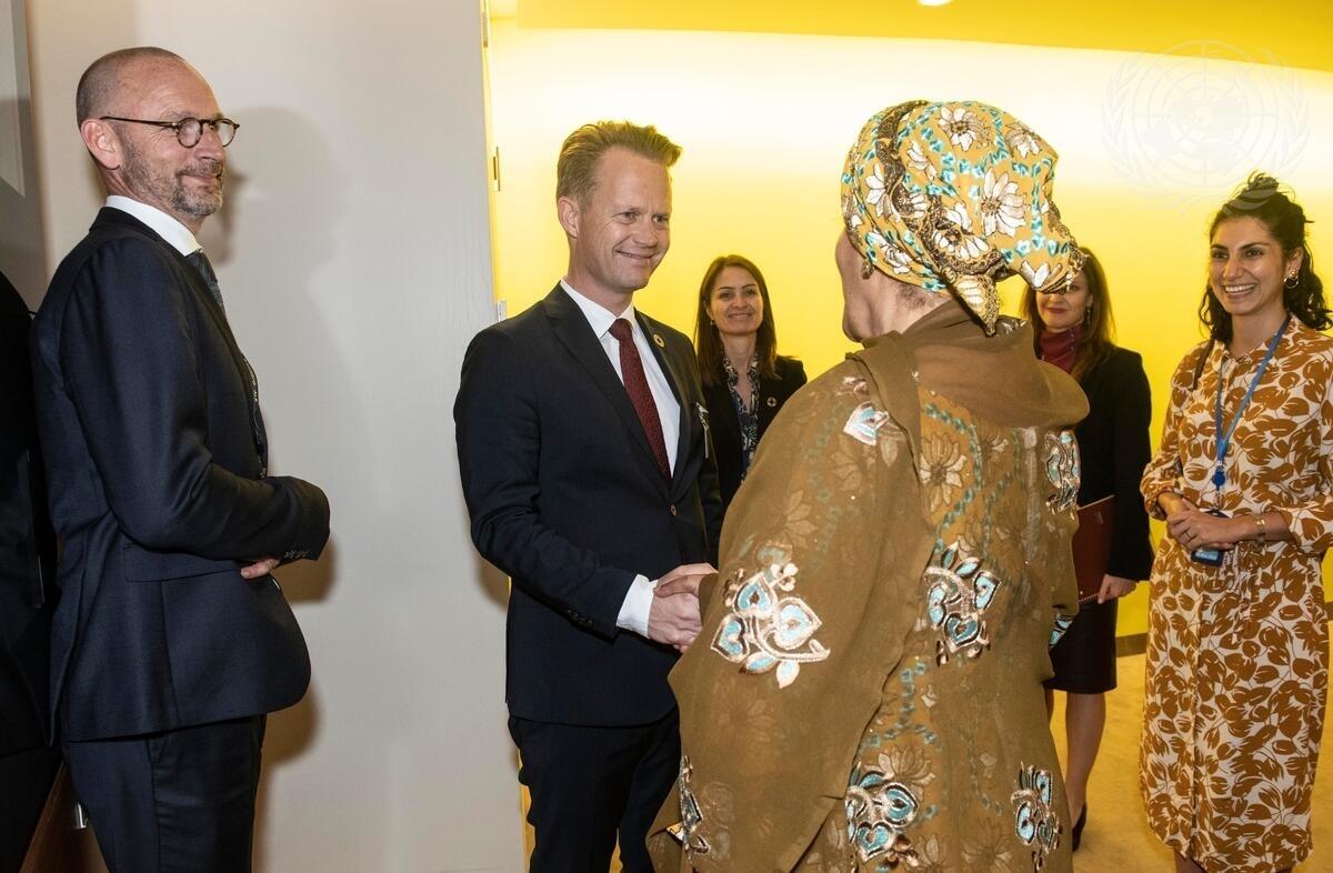 Deputy Secretary-General Amina J. Mohammed (back to camera) meets Jeppe Kofod, Minister for Foreign Affairs of Denmark.