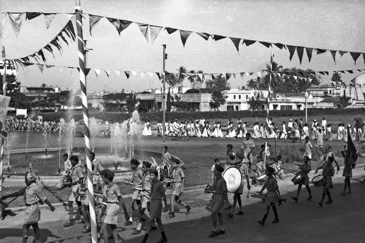 This photograph shows a parade, held in honour of UN Day, passing the Bangalore Corporation office buildings.