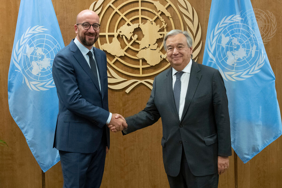 Secretary-General António Guterres (right) meets with Charles Michel, Prime Minister of Belgium.