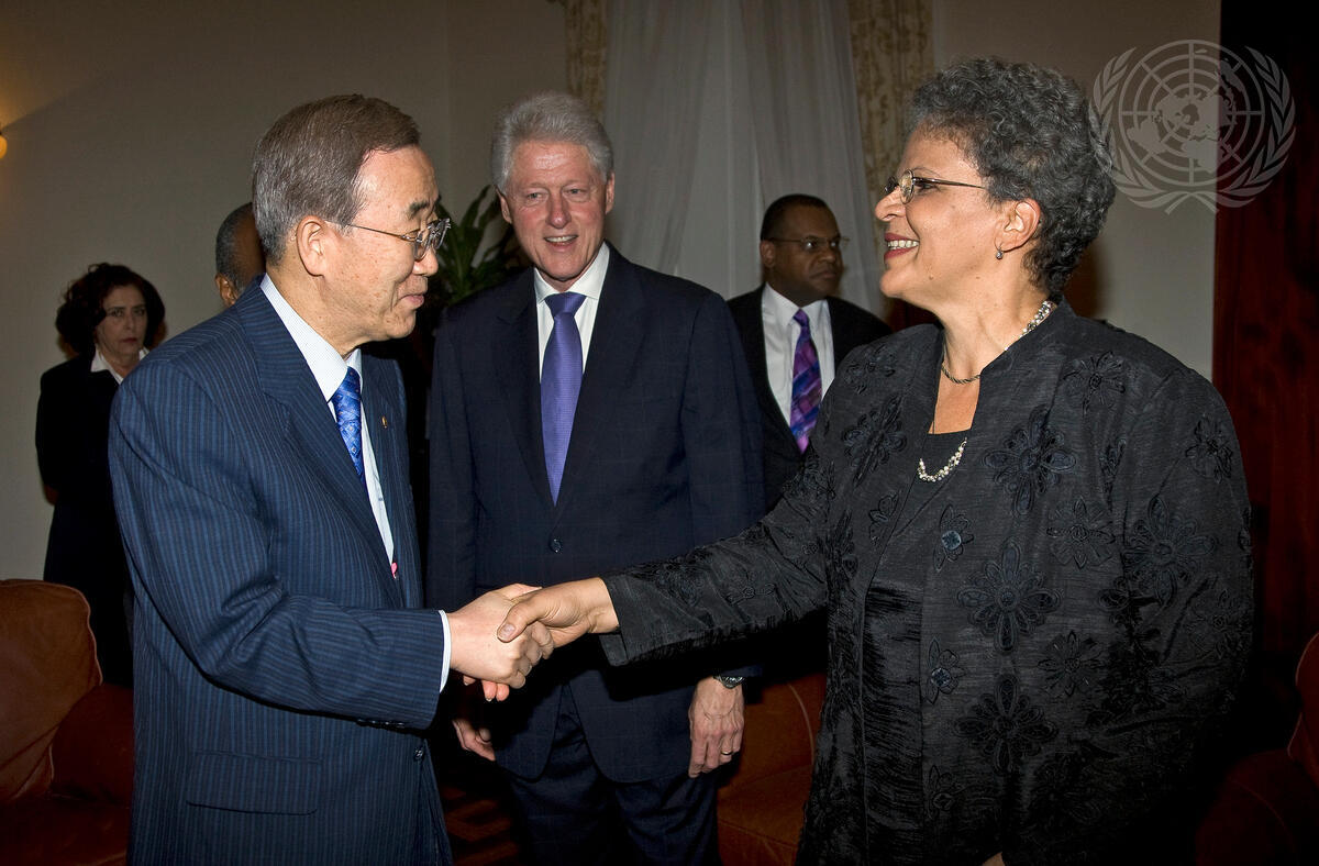 Secretary-General Ban Ki-moon (left) shakes hands with Michèle Duvivier Pierre-Louis, Prime Minister of Haiti, as Bill Clinton, former President of the United States of America, looks on.