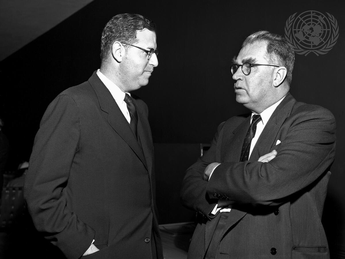 Mr. Abba Eban (left) of Israel, and Mr. Leslie Knox Munro of New Zealand are seen here as they were talking together before the opening of the session. Both are their countries' permanent representatives to the U.N.